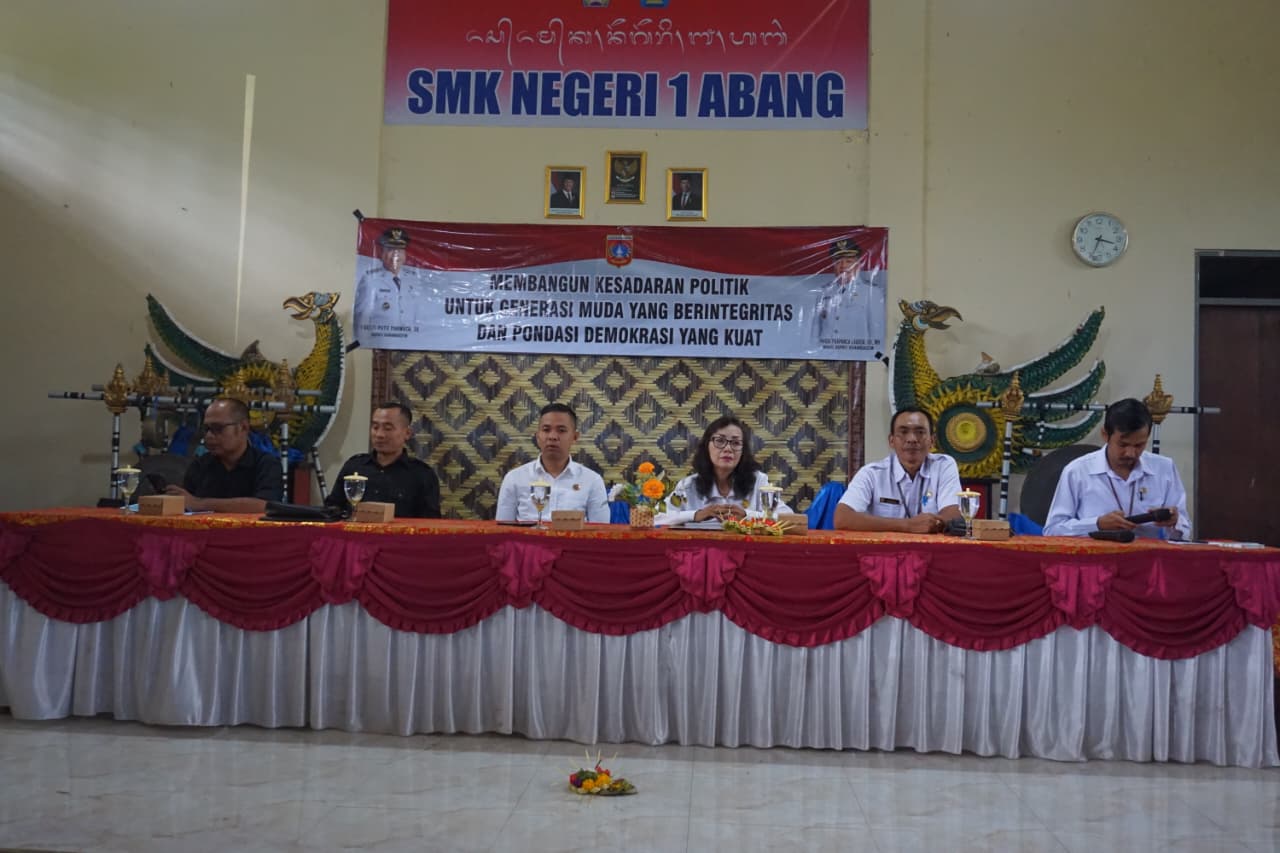 Badan Kesatuan Bangsa dan Politik (Kesbangpol) Kabupaten Karangasem gencar melaksanakan program Pendidikan Politik kepada Pemilih Pemula dengan menyasar pelajar sebagai calon pemilih pemula. Hari ini, Rabu, 15 Oktober 2025, kegiatan tersebut dilaksanakan di SMK Negeri 1 Abang dengan tema “Membangun Kesadaran Politik Untuk Generasi Muda Yang Berintegritas dan Pondasi Demokrasi Yang Kuat”.