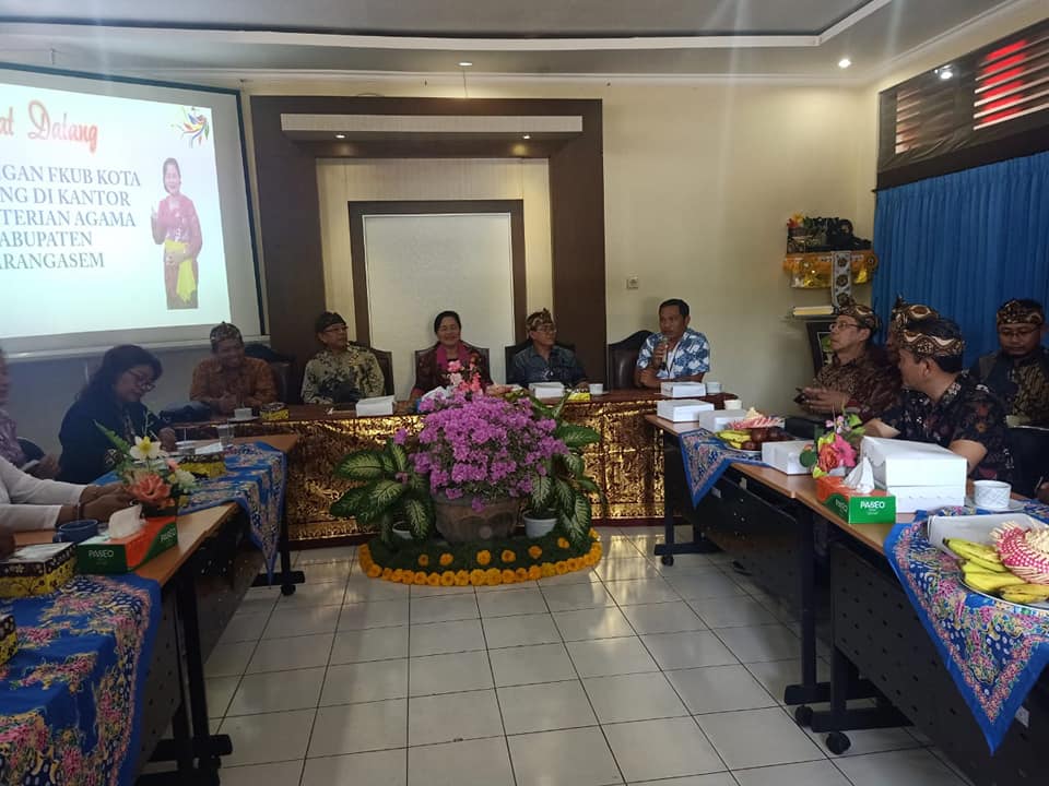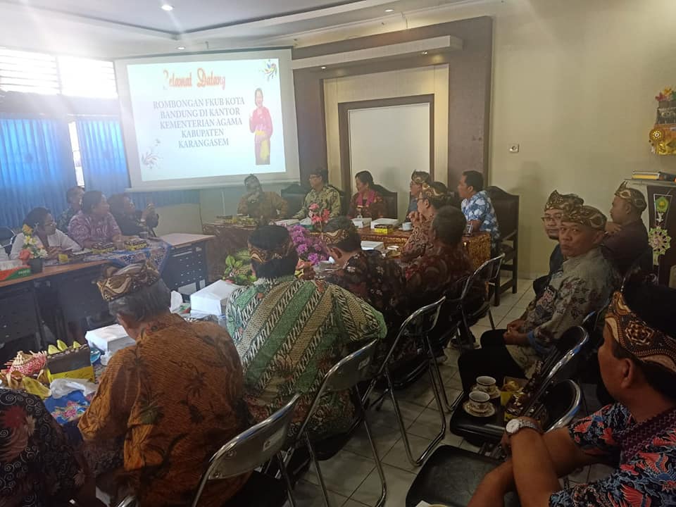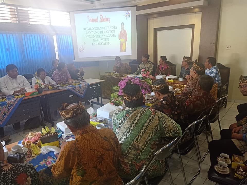 Melaporkan kegiatan penerimaan kunjungan kerja dari FKUB Kota Bandung ke FKUB Kabupaten Karangasem diterima oleh Kepala Badan Kesbangpol Kab Karangasem yang pada kesempatan ini diwakili oleh Kepala Bidang Ketahanan Bangsa a.n I Ketut Juni Arsa Wijaya,SSTP MAP. Didampingi oleh Ketua Kemenag kab Karangasem dan Ketua FKUB Kab.Karangasem. Rombongan FKUB Kota Bandung ketua Ahmad Suherman. Kabid Kewaspadaan Nasional Bandung Haji Iwan. Kemenag Kota Bandung Dr H Yusuf Umar. Kabag Kesra Dr H.Bambang Sukardi,M.Si dan beserta rombongan berjumlah 21 orang.