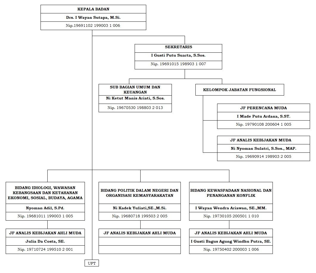[fusion_dropcap color=”” text_color=”” boxed=”no” boxed_radius=”” class=”” id=””]B[/fusion_dropcap]adan Kesatuan Bangsa Politik Kabupaten Karangasem adalah merupakan salah satu lembaga teknis daerah, dipimpin oleh seorang Kepala Badan yang berada dibawah dan bertanggung jawab kepada Bupati melalui Sekretaris Daerah.