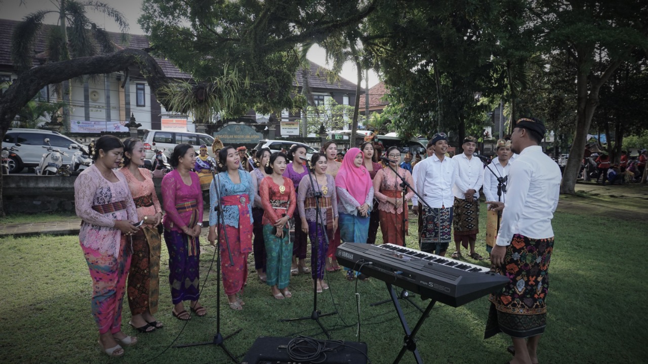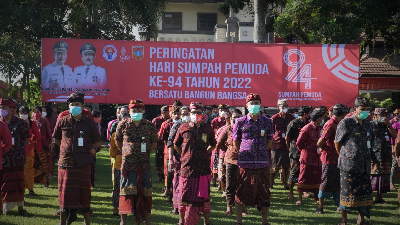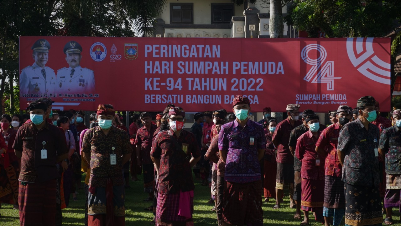 Telah dilaksanakan Upacara Peringatan Hari Sumpah Pemuda Ke-94 Tahun 2022 dengan Tema “Bersatu Bangun Bangsa” Sebagai Inspektur Upacara, Bupati Karangasem I Gede Dana, S.Pd., M.Si., dan selaku Komandan Upacara I Gede Agus Sudarsana, S.Kom, (Pemuda dari Organisasi Pemuda Pancasila) yang diikuti sebanyak ± 300 orang, yang dilaksanakan pada hari Jumat tanggal 28 Oktober 2022 Pukul 08.20 Wita bertempat di Lapangan Tanah Aron Amlapura Jln. Ngurah Rai Kec/Kab Karangasem. Peringatan Hari Sumpah Pemuda adalah upaya kita menghadirkan sejarah masa lalu untuk direnungkan, dipelajari, ditemukan kristalisasi pembelajaran kebaikan untuk dijadikan teladan dan inspirasi penggerak langkah menuju visi bangsa yang besar. Peringatan Hari Sumpah Pemuda ke-94 merupakan sebuah momentum sejarah bagi bangsa kita dalam meningkatkan rasa solidaritas berbangsa dan bernegara. Dengan Dilaksanakan Upacara peringatan Hari Sumpah Pemuda ke-94 di Lapangan Tanah Aron dapat dilaksanakan dengan Hikmat yang bertujuan kedepannya dapat membangkitkan rasa/Jiwa Nasionalis berbangsa dan bernegara di kalangan para pemuda